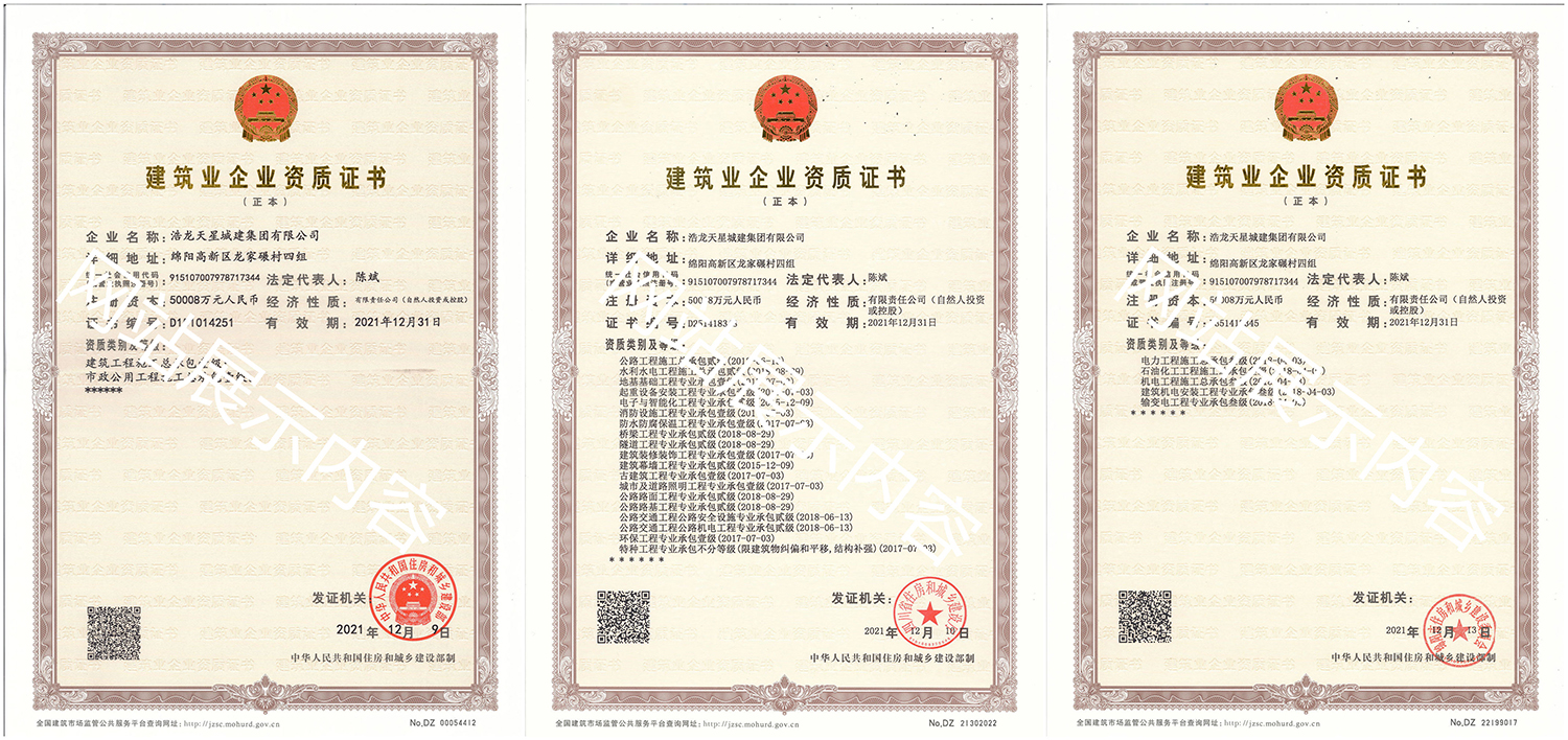 浩龍?zhí)煨浅墙瘓F(tuán)有限公司,2007年成立于“李白故鄉(xiāng)、中國(guó)科技城”—四川省綿陽(yáng)市,企業(yè)注冊(cè)資本金5.0008億元。公司共有27項(xiàng)建筑業(yè)企業(yè)資質(zhì),其中國(guó)家一級(jí)資質(zhì)11項(xiàng),二級(jí)資質(zhì)10項(xiàng),三級(jí)資質(zhì)5項(xiàng),特種資質(zhì)不分等級(jí)1項(xiàng),類別涵蓋建筑、市政、水利、機(jī)電、隧道、起重設(shè)備安裝等基礎(chǔ)及未來發(fā)展重點(diǎn)專業(yè)。公司...